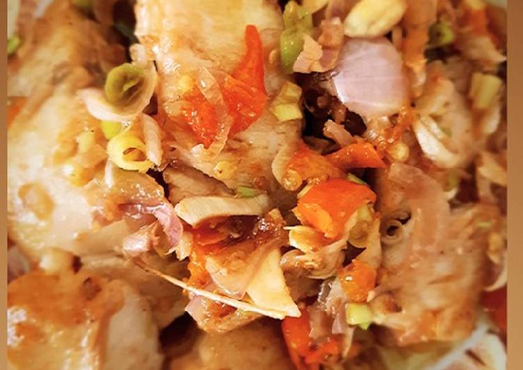 Pertama-tama, ikan segar dipotong menjadi beberapa bagian dan kemudian direndam dengan air jeruk nipis untuk menghilangkan bau amisnya.