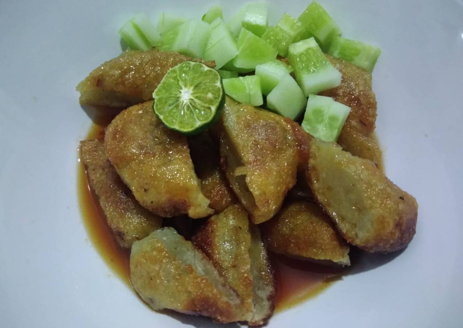 Pempek ikan tongkol biasanya disajikan dengan kuah cuka yang asam dan pedas.